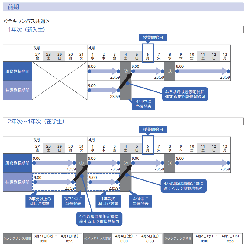 2026年度前期履修登録スケジュールは以下のとおりです。必ずスケジュール内で履修登録を完了させてください。